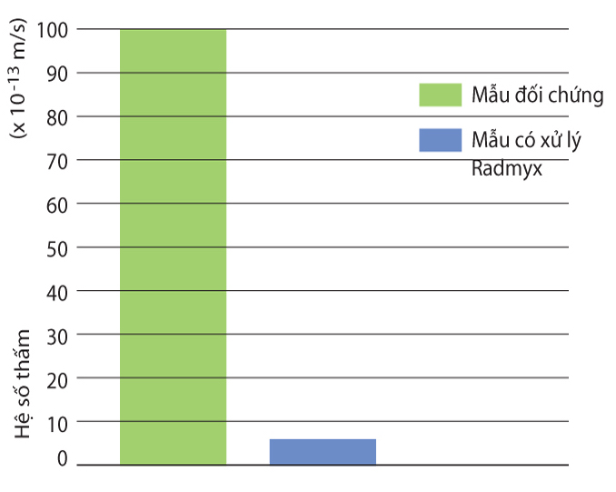 Radmyx Concentrate cho ta hiệu quả giảm thấm nước tới 93%. Chính là từ hệ thống mạng tinh thể Radmyx được phân bố và phát triền đều khắp trong khu vực đã hiện thực được khả năng tối ưu hóa công tác bảo vệ.